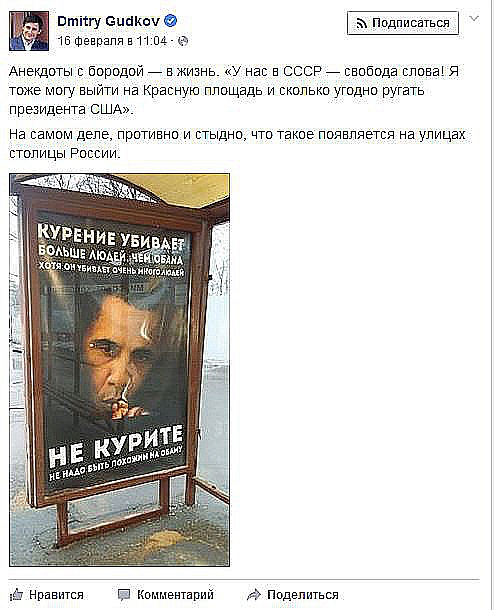 Антитабачная реклама с изображением Барака Обамы несколько дней провисела на остановке в Москве. Неизвестные вскрыли конструкцию и незаконно разместили рекламу с курящим президентом США и надписью: «Курение убивает больше людей, чем Обама. Хотя он убивает очень много людей. Не курите. Не надо быть похожим на Обаму».