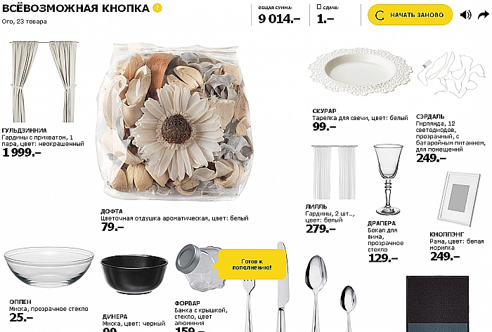 «Всёвозможная кнопка» - это уникальный сервис, который позволит пользователю выбрать доступный для себя бюджет и определиться с товарами, которые можно купить за эти деньги. В рамках проекта, перед агентством стояла задача рассказать аудитории, что в ИКЕА можно приобрести множество разнообразных товаров на любую, даже самую маленькую сумму.