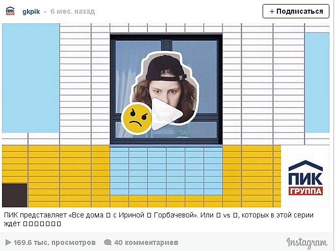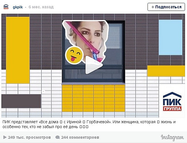 Группа компаний ПИК и креативное агентство Leo Burnett Moscow в рамках кампании «#Влюбляйтесь» создали спецпроект «Все дома с Ириной Горбачевой» и построили свой первый виртуальный дом в соцсети Instagram. Рекламщики создали аккаунт в Instagram для своего дома на Варшавском шоссе . В этом виртуальном доме "поселилась" Ирина Горбачева.