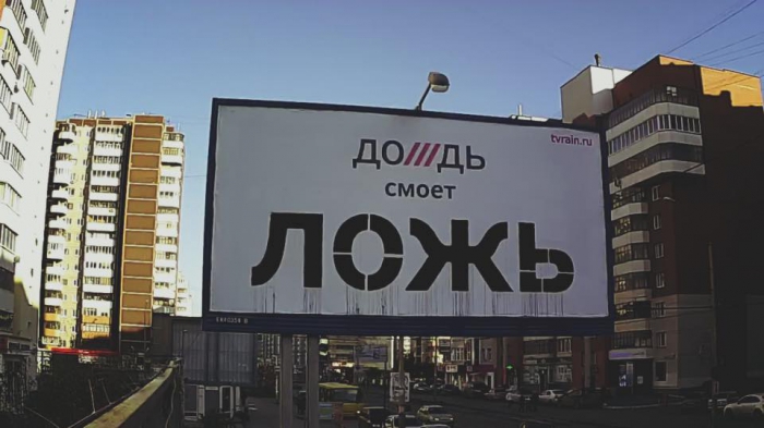 Телеканал "Дождь" запустил в Екатеринбурге необычную акцию, ключевой фигурой которой стал билборд с надписью "Дождь смоет ложь". Главной особенностью билборда заключается в том, что слово "ложь" написано гуашью.Таким образом, во время дождей оно постепенно смывадось до тех пор, пока от "лжи" ничего не осталось.