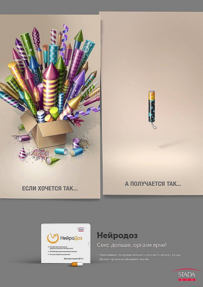 Российский фармацевтический холдинг STADA CIS запустил рекламную кампанию в поддержку препарата "Нейродоз", предназначенного для лечения мужских проблем.В рамках кампании были созданы принты, построенные на сравнении ожиданий и реальности. Печатные материалы размещены в журналах, аэропортах, барах и в интернете.