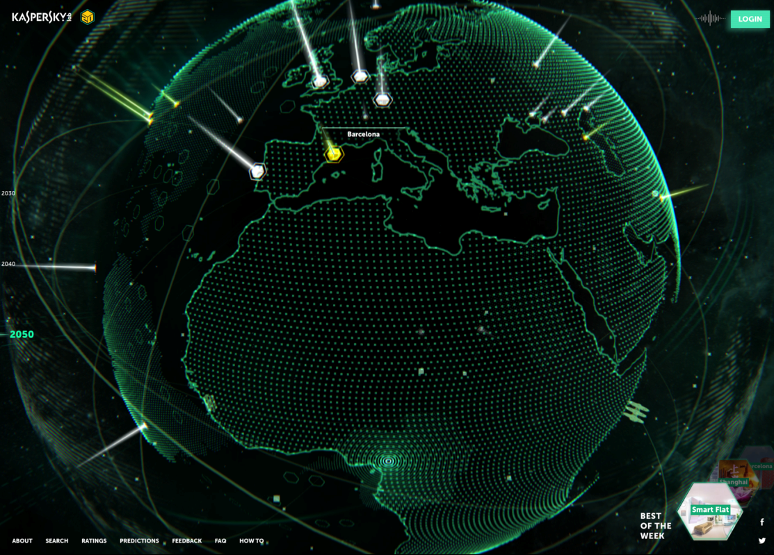 К 20-летнему юбилею Лаборатории Касперского мы запустили масштабный интерактивный проект, посвященный будущему нашей планеты и возрастающей роли технологий в жизни людей. Планета разделена на множество географических участков - гексагонов - каждый из которых включает в себя прогноз, посвященный определенному аспекту жизни общества. Многие локации дополнены футуристическими изображениями и 360-панорамами.