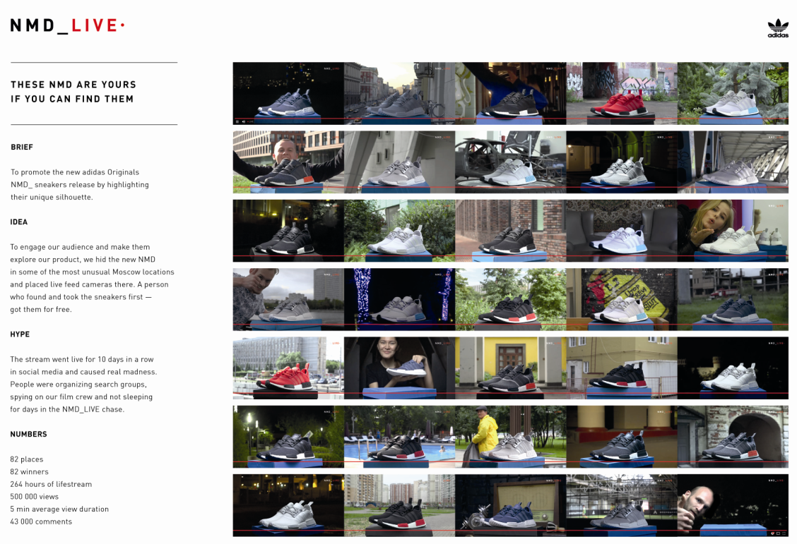 Чтобы создать шумиху вокруг новой коллекции кроссов NMD и популяризировать её уникальный силуэт среди целевой аудитории, мы заставили весь город смотреть на нее 24/7 в течение 10 дней.