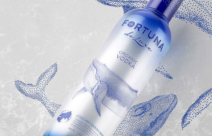 Образ подводного мира завершает цветовой фон – бутылка изготовлена из стекла с использованием технологии частичной сатинации, переходящей в синий коутинг.