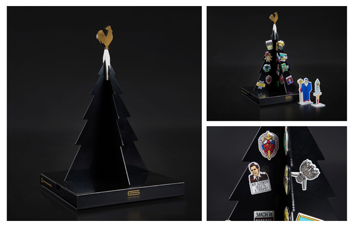 Сувенирный промонабор для адвокатского бюро «БАРТОЛИУС» Новогодняя Ёлка Правосудия (НЁП), приуроченный к году Петуха (году «П»). Набор состоит из металлической ёлки и двух комплектов магнитных ёлочных украшений патриотического и протестного характера. Сама Ёлка олицетворяет судью, а Дед Мороз и Снегурочка выступают в роли прокурора и адвоката соответственно. Вместо традиционной звезды – флюгер, который поворачивается в зависимости от направления политического ветра.