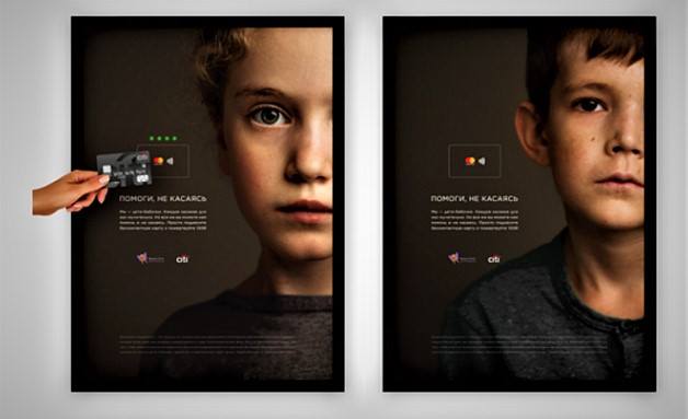 Проект «Помоги, не касаясь» состоит из уникальных плакатов с технологией бесконтактной оплаты. Необходимо просто поднести карту к плакату и пожертвовать 100 рублей. Плакаты можно найти в торговых центрах, кинотеатрах, ресторанах и автосалонах Москвы и Санкт-Петербурга.