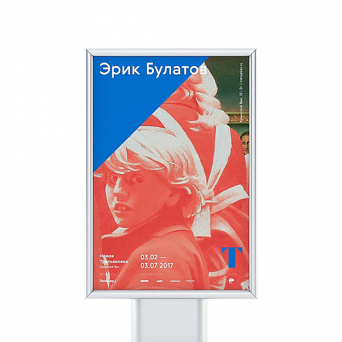 В визуальном стиле Новой Третьяковки есть и свой особенный элемент, которого нет у других площадок, – радикально укрупненный треугольник буквы «Т», образующий диагональ. Он символизирует движение, взгляд в будущее и новую точку зрения на искусство.