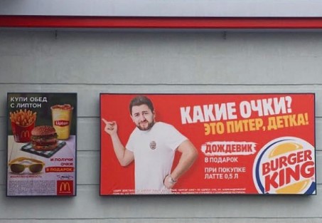 В Санкт-Петербурге возле плаката с рекламой акции «Солнечные очки в подарок» от McDonald's «Король бургеров» разместил свое объявление, на котором нарисован недоумевающий бородач, а подпись гласит: «Какие очки? Это Питер, детка! Дождевик бесплатно при покупке латте!».