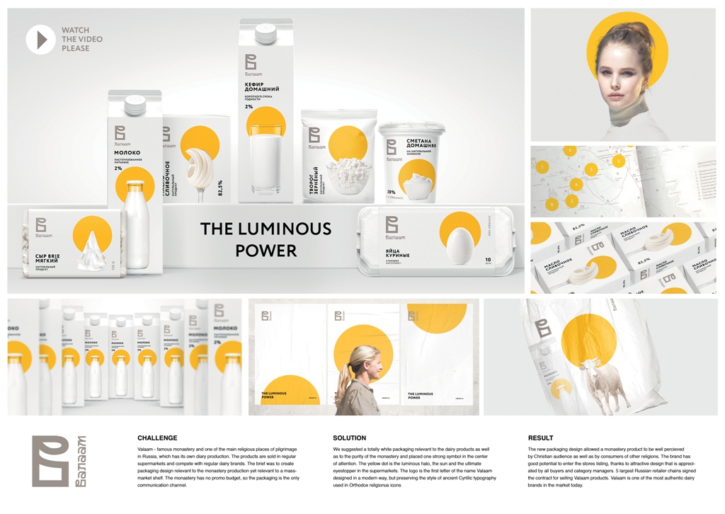 Солнце, ореол, чистота, первозданность, доброта, завершенность и совершенство. Разве эти слова не подходят натуральным продуктам лучше всего? В сочетании с современным подходом к русской традиционной типографике и с исключительно чистым дизайном упаковки, «Валаам» является одним из самых аутентичных натуральных брендов на современном рынке.