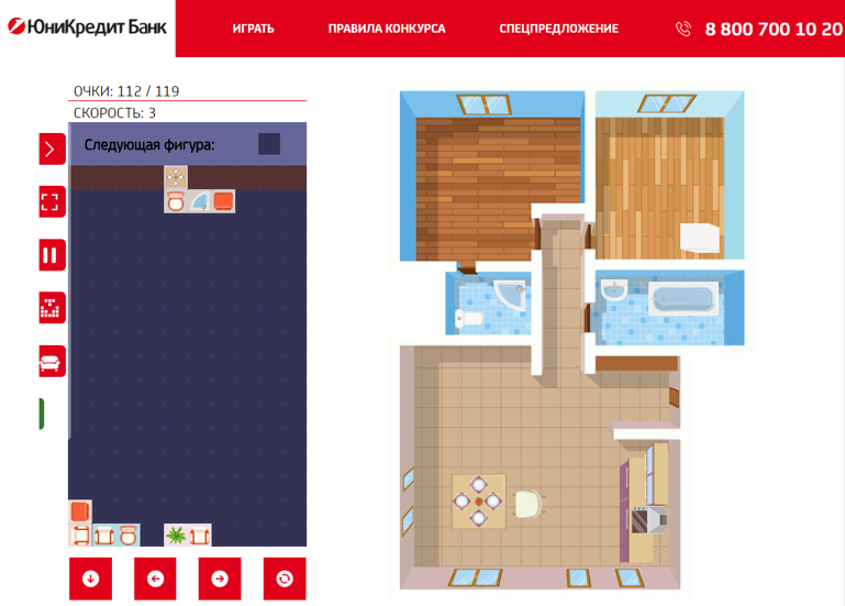 Участники могли поиграть в «Тетрис» в своё удовольствие без регистрации, либо зарегистрироваться через социальные сети и побороться за один из 3 денежных призов. Для участия в розыгрыше нужно было сделать расстановку, поделиться ей у себя на странице с хэштегами #ипотечныйтетрис и #юникредитбанк и собирать лайки под своей публикацией.