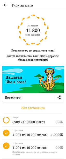 Акция «Гиги за шаги» предполагает ежедневное получение дополнительных 100 МБ к своему пакету мобильного интернета. Для этого достаточно пройти 10 000 шагов и более в течение дня.