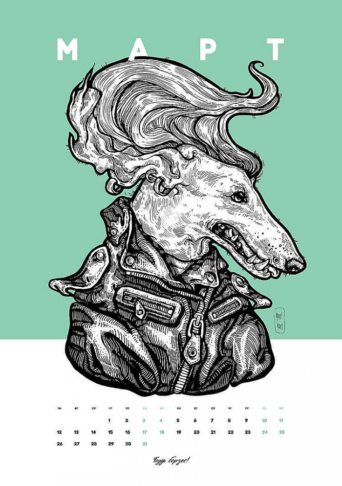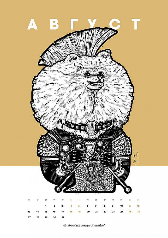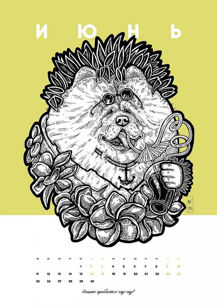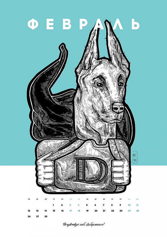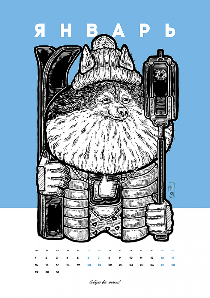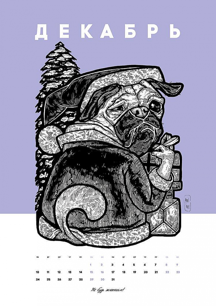 В календаре дизайнеры собрали банду из 12 пород собак и обыграли их вербально и визуально. Персонажи с каждой страницы дают полезные советы, как провести Новый год легко, играючи и на позитиве.