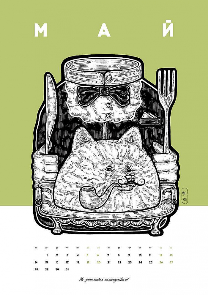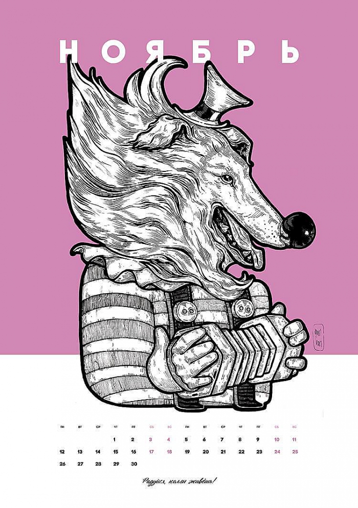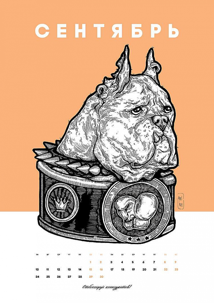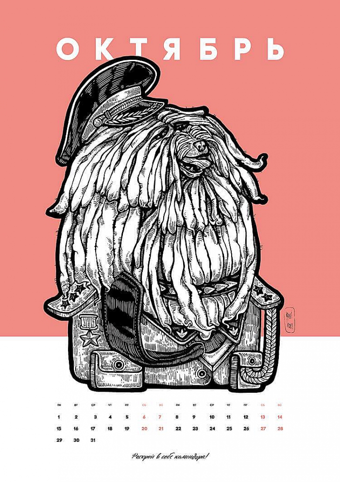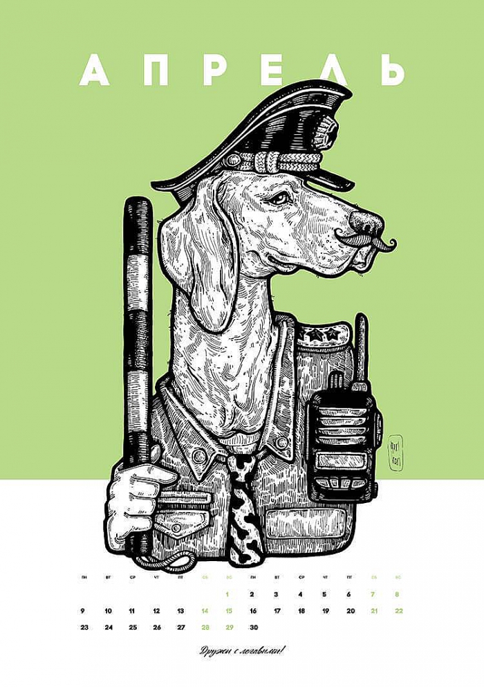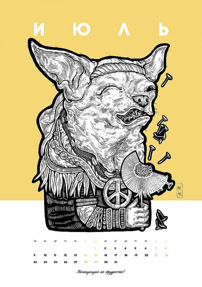 В календаре дизайнеры собрали банду из 12 пород собак и обыграли их вербально и визуально. Персонажи с каждой страницы дают полезные советы, как провести Новый год легко, играючи и на позитиве.