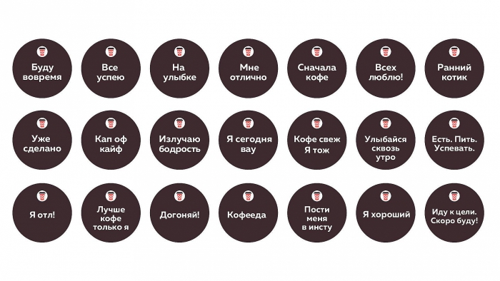 Дополнительным элементом дизайна и средством общения с аудиторией являются фирменные стикеры с надписями, поддерживающими образ современной кофейни, для активных, вечно торопящихся москвичей. Стикеры раздаются бариста на кассах, клеятся на стаканы, позволяют аудитории выразить свое настроение.