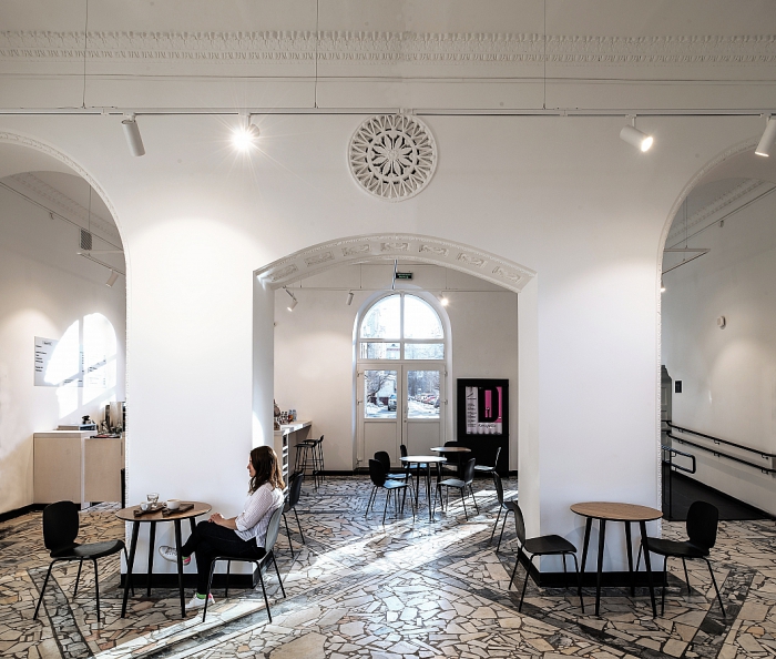В фойе внимание зрителя акцентируется на элементах брендинга «Москино»: стенды афиш — не безликие картинки в рядах рамок, а экспонаты, занимающие должное место в интерьере, с расчетом на то, что даже массовые прокатные фильмы однажды вспомнят, что плакат — это искусство.