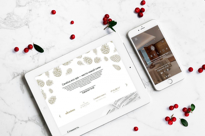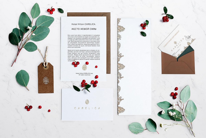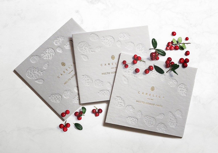 На основе выбранного позиционирования, а также с учётом элементов, уже интегрированных в интерьер («северная» цветовая гамма, текстурный камень, дерево, мох, галька), были разработан фирменный стиль комплекса.