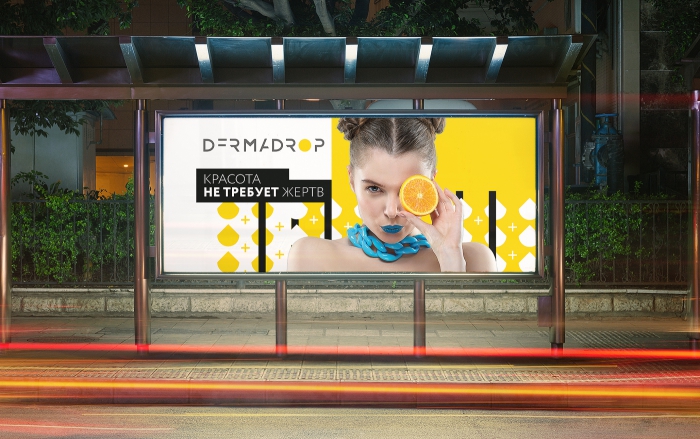 Бренду было необходимо добавить блеска, глянца с налетом высокотехнологичности и уникальности; в рамках новой айдентики Dermadrop была придумана метафора бренда — отдых для вашей кожи. Она передает ощущение после десятичасового сна в выходной день или даже после солнечных ванн на побережье океана. Именно об этом мечтают молодые женщины, листающие Cosmo и Elle — об идеальной коже лица.
