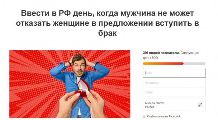 2. От канала «Ю» запущена петиция о «Введении в России дня, когда мужчина не может отказать женщине в предложении вступить в брак».