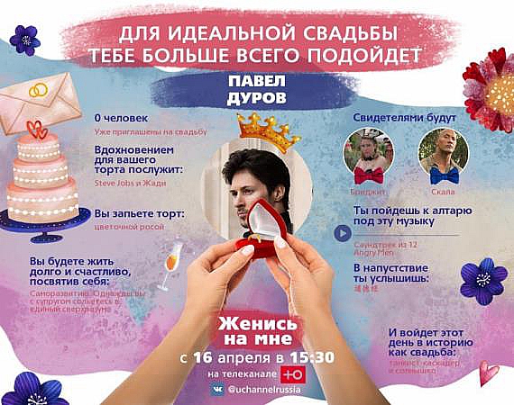 3. Реализован спецпроект во «ВКонтакте» для посетителей группы телеканала «Ю», который включает в себя бота-сваху, подбирающего пользователю идеальную пару для свадьбы, а также динамическую обложку, которая показывала последнего обратившегося к боту.