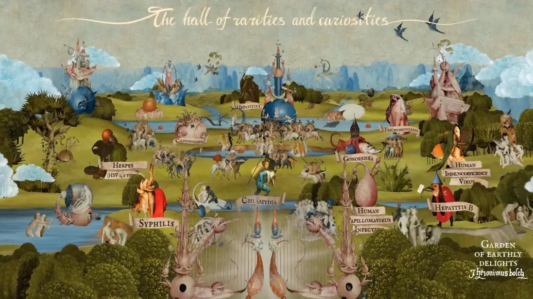 За основу проекта был взят один из самых известных триптихов Босха – «Сад земных наслаждений». Язык художника настолько индивидуален, что целые поколения историков спорят о значении этих образов, выдвигая множество конкурирующих, а иногда и прямо противоположных интерпретаций. Культурологи точно не могут сказать, изобразил ли Босх на центральной панели царство плотских грехов или, наоборот, утопический мир безгрешности. Это очень коррелирует с темой инфекций, передаваемых половым путем, разговор о которых часто находится под табу.