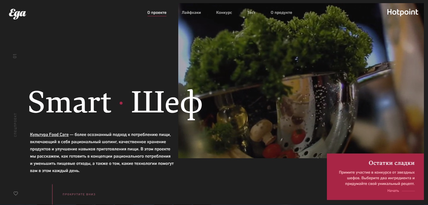 В совместном проекте с компанией Hotpoint мы решили рассказать о культуре FoodCare – концепции рационального потребления и уменьшения пищевых отходов, а также о том, какие технологии помогут в этом каждый день. При помощи звездных столичных шефов мы показали пользователям десятки вариантов рецептов вкусных блюд из остатков продуктов. И предложили им пройти познавательный тест на знание условий хранения тех или иных ингредиентов в холодильнике.