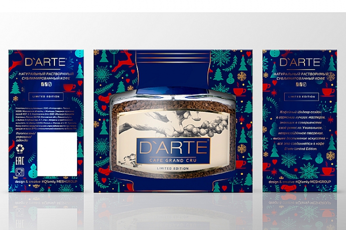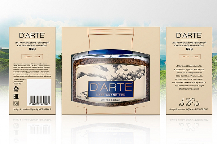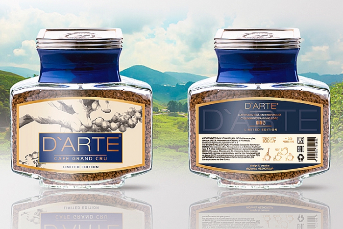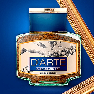 Создание упаковки, этикетки и разработка новой формы банки для лимитированной серии растворимого кофе премиум-линейки D`Arte,входящего в немецкий концерн Milagro Beverage Company. В поддержку презентации бренда запущена федеральная благотворительная акция «Искусство в каждом сердце» для творческого развития воспитанников российских детских домов одними из лучших представителей Союза художников России (Никас Сафронов и Владислав Коваль). Мероприятие призвано обогатить культурное наследие России.