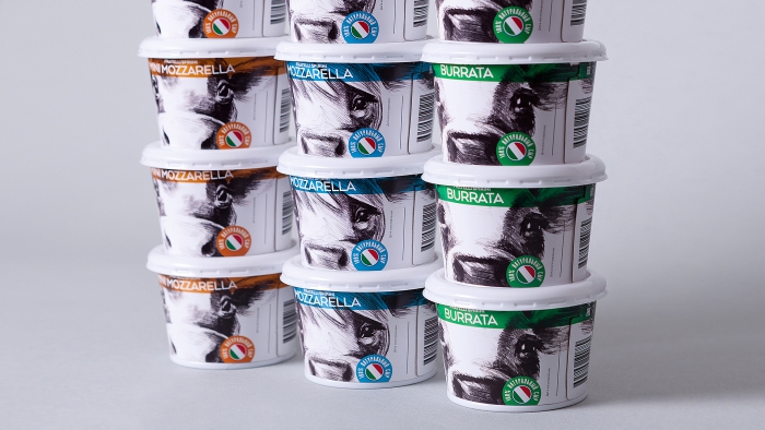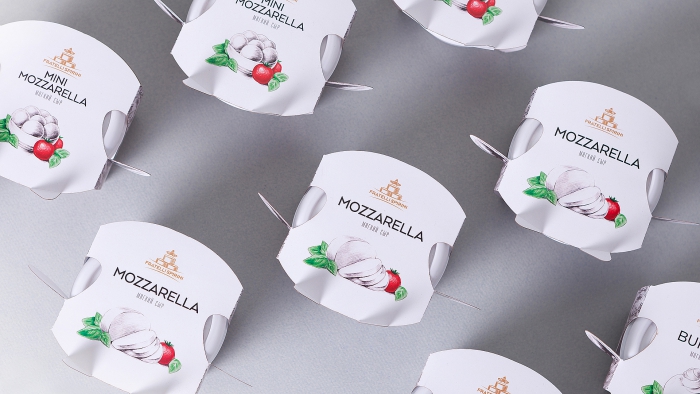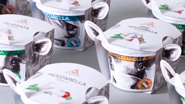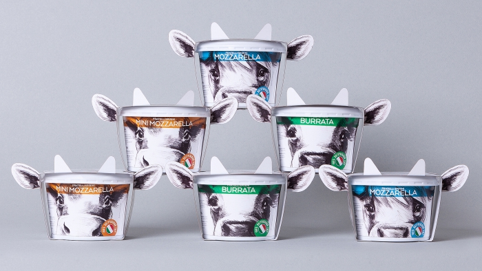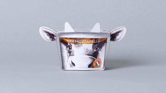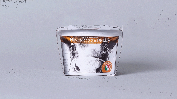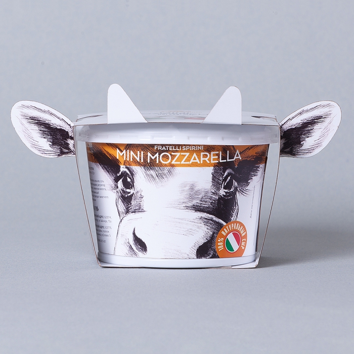 Эффект дизайна упаковки Fratelli Spirini основан на сочетании стильной черно-белой графики и оригинальной формы шубера. Упаковка дополнена выносными элементами, создающими образ симпатичной коровы. Обечайка с вырубленной формой ушей и рогов выгодно выделяет продукт на магазинной полке, а цветовые акценты позволяют с легкостью дифференцировать различные сорта сыра. Присутствие образа итальянского флага и продуктовой зоны в его цветах служит дополнительным маркером технологий производства, вдохновленных традиционным итальянским сыроварением.