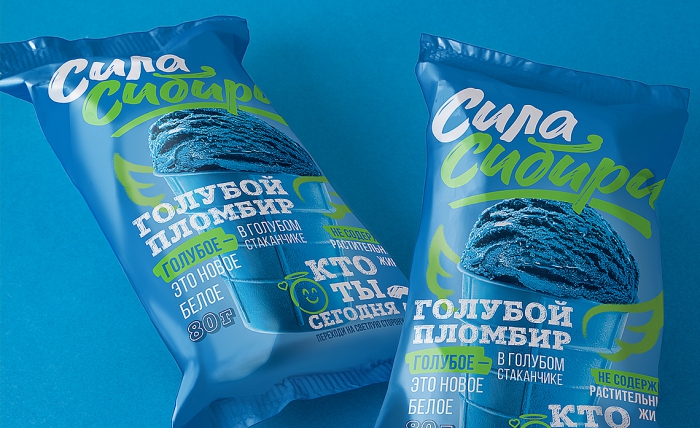 Сочетание привычной формы и нестандартного цвета подчеркивает уникальность мороженого и помогает выделиться на полке. Контраст присутствует не только в цветах, но и в текстурах упаковки — матовая бумага с выборочной лакировкой также выгодно отличают бренд среди соседей.