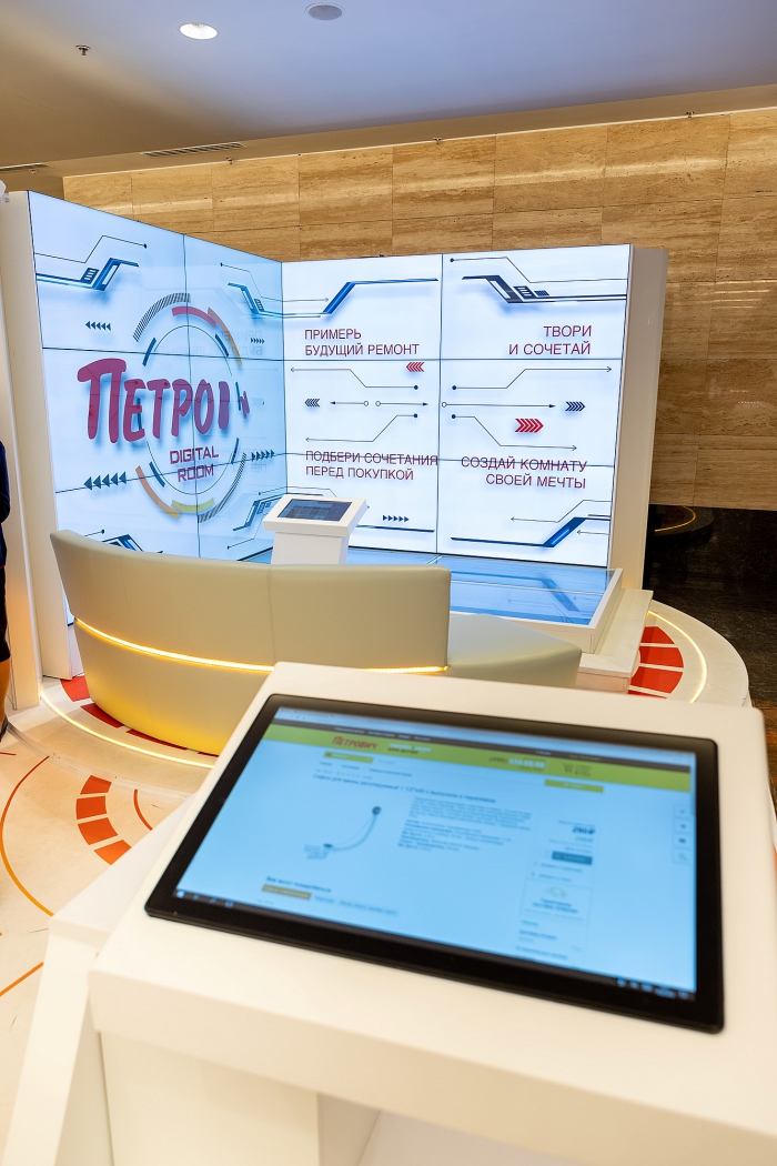 Проект выполнен на ИТ-платформе собственной разработки. Цифровой шоурум оборудован современными LCD-дисплеями. Они обеспечивают четкое изображение, а также высокую видимость и одинаковую яркость на бесшовной видеостене. В ассортименте цифровой комнаты — тысячи наименований отделочных материалов. Среди прочего оборудования — планшет для моделирования дизайна, тач-экран для заказа продукции и комфортный диван.