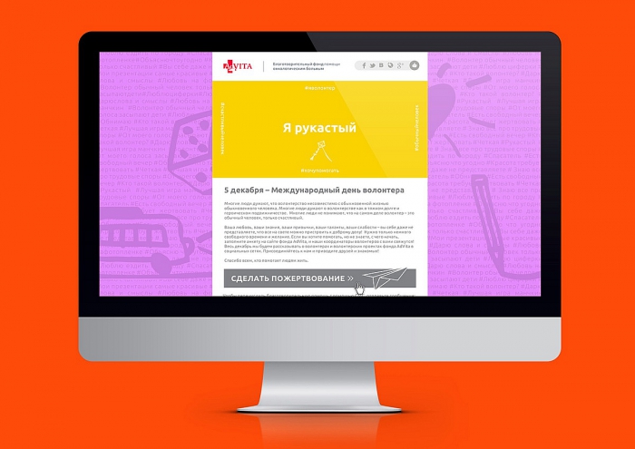 В декабре 2015 года была проведена рекламная кампания, приуроченная к 5 декабря – Международному дню волонтера. Цель кампании — увеличить число жертвователей и волонтеров фонда AdVita. Перед нами стояла задача разработать дизайн рекламной кампании, приуроченной к 5 декабря – Международному дню волонтера.