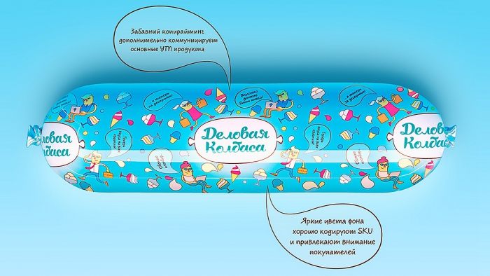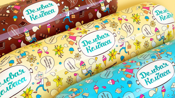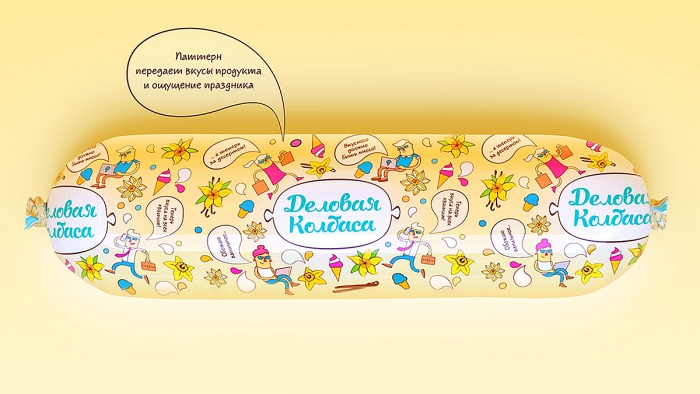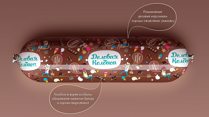 ЗАДАЧА — мороженое под названием «Деловая колбаса» в большой семейной упаковке присутствует в ассортименте почти всех крупных производителей мороженого. И, поскольку, название «Деловая колбаса» не является уникальным и охраноспособным, то продукт клиента надо было выделить, среди множества конкурентов, за счет оригинального креативного дизайна.