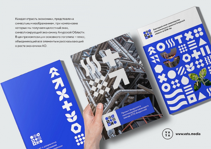 Каждая отрасль экономики, представлена символьным изображением, при компоновке которых мы получаем целостный знак, символизирующий экономику Амурской Области. В центре композиции основного логотипа — плюс, объединяющий все элементы и рассказывающий о росте экономики АО.
