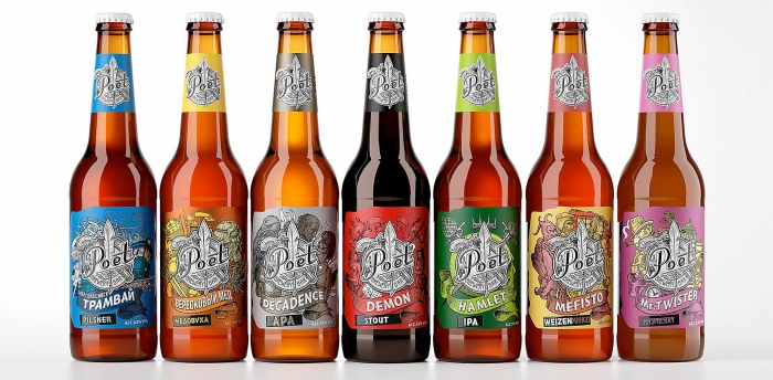 Мы работали над пивной маркой «Poet» и создавали полную визуальную индивидуальность каждого нового сорта. Для создания основного логотипа пивоваренного завода и отображений названий каждого сорта пива были разработаны авторские шрифты. У каждого вкуса есть своя уникальная иллюстрация, которая отражает стихотворение, соответствующее каждому пиву. Стихи не изображены прямо, основные идеи заложены в дизайне каждого вкуса, что делает поиск элементов дизайна еще более увлекательным.