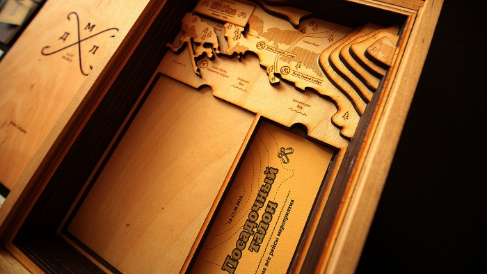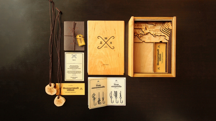 Для каждого пригласительного студией были созданы: короб с рельефной картой местности, приглашение на изысканной дизайнерской бумаге, буклет с вариантами рыболовных узлов и памятные медальоны из можжевельника. Приятная фактура древесины, тонкий запах коры, тщательная проработка деталей, оригинальность исполнения — всё это создало ощущение эксклюзивности продукта, что было немаловажно для данного проекта.