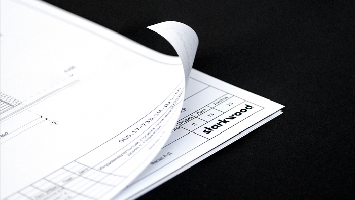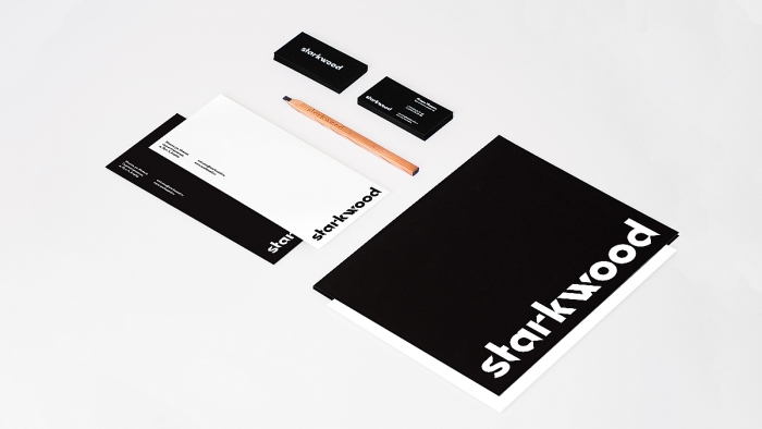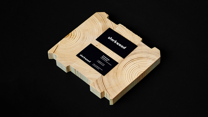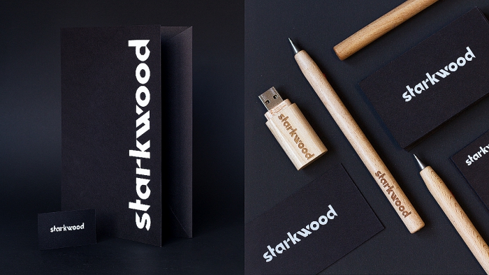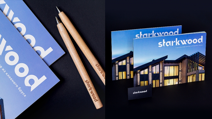 Логотип компании — уникальное шрифтовое решение. Символы создают впечатление, что они выточены из бруса и собраны в конструкцию. Уверенное, звучное название и логотип подчеркивают направление деятельности. Сочетание черного цвета, строгих линий и контрформ дают прямую отсылку к проектной документации и чертежам, сопровождающим строительство дома. Фирменный стиль Starkwood — это громкое и уверенное заявление бренда о серьезном подходе, внимательности к деталям и безупречной точности.