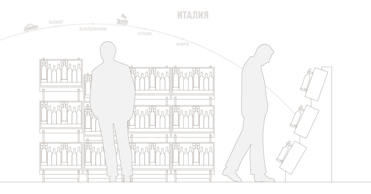 В рамках концепции less is more мы полностью пересмотрели организацию пространства магазина. Зал делится на два ключевых направления — красное и белое. С этого и начинается винное путешествие, совершить которое помогает, стилизованная под карту, навигация. Чтобы сделать пространство максимально приятным и дружелюбным, нам пришлось изобрести полки заново. Здесь они не отталкивают покупателей, как в других магазинах, не заставляют их тянуться на самый верх или кланяться, смотря вниз. Вино удобно рассматривать и брать, ведь оно находится под углом 45 градусов на той высоте, на которой брать его в руки удобнее всего.