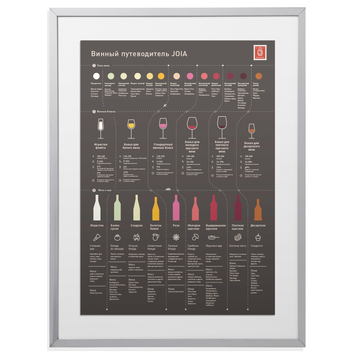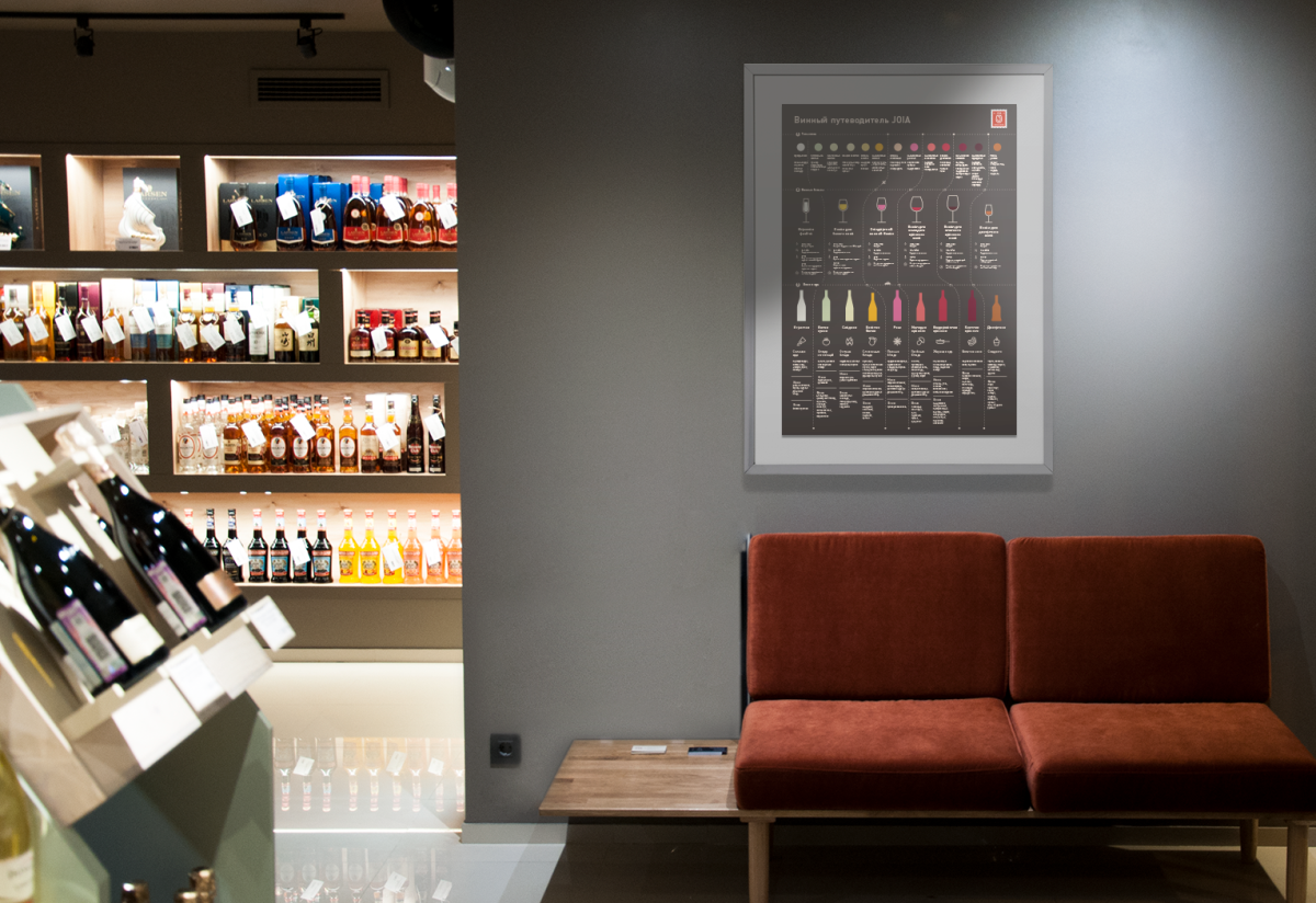 Помимо навигации, стены магазина оформлены элементами, поддерживающими концепцию знаний и путешествий. Мы разработали подробную инфографику, рассказывающую о сортах вина и о том, как, из чего и с чем их правильно пить. Также здесь находится интерактивная карта мира, на которой лейблами отмечены регионы и поставщики, вина которых представлены в магазине.