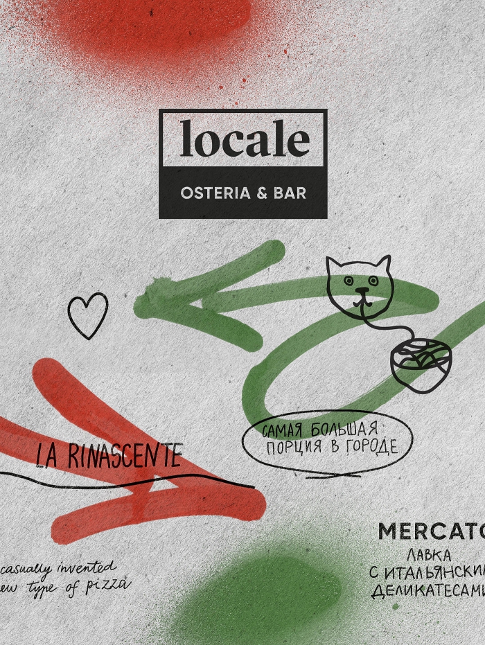Летом Italy Group совместно с Dreamteam запустили проект Mercato Locale, для которого мы разработали логотип, фирменный стиль, дизайн полиграфии и упаковки, навигационные и экстерьерные решения. Лето кончилось, и фуд-маркет переехал с заднего двора Владимирского Пассажа в само здание, где занял два этажа. Теперь Locale — не только остерия (ресторан домашней итальянской кухни), но и бар.