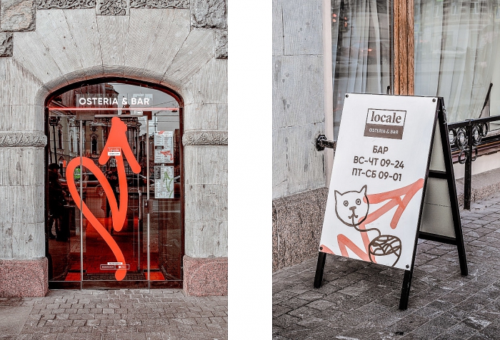 Ресторан не замечали из-за сложной локации, поэтому в первую очередь мы разработали выразительную входную группу. На входе стоит разрисованный от руки штендер, а на двери нарисована большая красная стрелка, нахально зазывающая прохожих. Встречают гостей хулиганские рисунки на стенах и уличный указатель.
