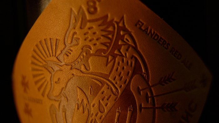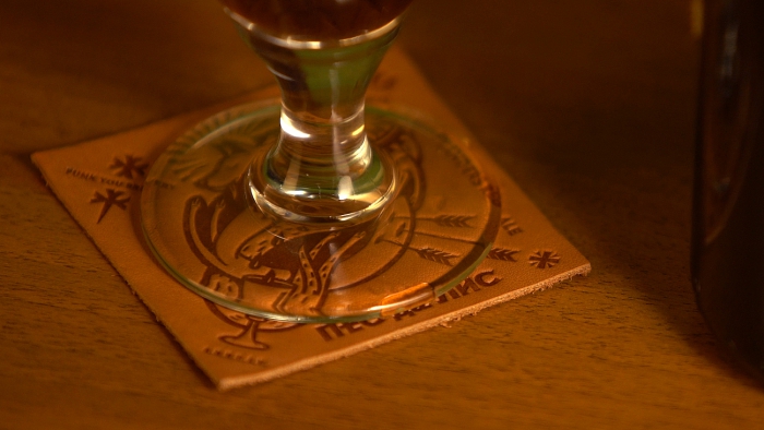 Такая этикетка должна быть гибкой, чтобы ее можно было наклеить на круглую поверхность бутылки, и при этом плотной, чтобы ее можно было использовать еще и в качестве бирдекеля — поэтому при выборе материала мы остановились на коже. Этикетка-бирдекель крепится к бутылке с помощью легкосъёмного силиконового клея. Потребитель, купив в баре бутылку эля, отклеивает этикетку, кладет ее на стол и ставит на нее бутылку или стакан. Уходя, потребитель может забрать этикетку-бирдекель с собой, и она становится дополнительным рекламным носителем.