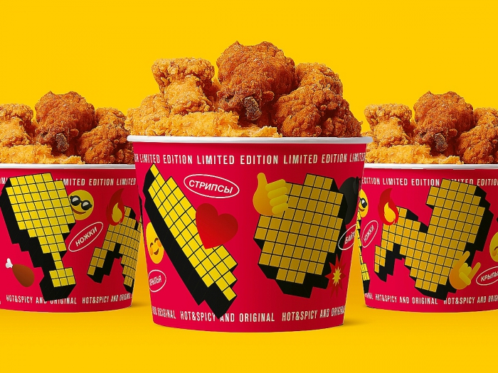 Итоговая айдентика – уверенная, смелая, живая, интерактивная. При этом строго систематизированная: лишенная любых случайных элементов и обладающая необходимой для большой сети гибкостью. Изменения коснулись всех носителей бренда KFC, включая упаковку продукции, рекламные коммуникации, меню-борды в ресторанах и другие «мелочи». На упаковке продукции появилось больше релевантных сообщений, которые несут и коммуникационный, и развлекательный характер. Обновилась и была тщательно проработана стилистика фуд-групп. Создана единая система расположения логотипа и полковника Сандерса на упаковке. Мы также пересмотрели цветовое кодирование и навигацию по группам продуктов – для этого команда проекта провела большую работу с меню, типами упаковок и инсайтами по продуктовым группам. Кроме того, агентством был разработан дизайн упаковки нескольких новых для сети продуктов (например, «темного бургера» и хот-догов), нескольких лимитированных серий продукции, а также интерфейсы и навигация цифровых терминалов самообслуживания.