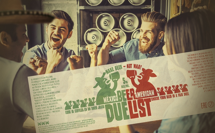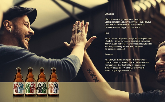 Чтобы спасти ситуацию, мы придумали бренд пива «Duelist» – пиво, которое не превратит дискуссии в битву. Даже если вам захочется выплеснуть пиво в лицо противнику, вы этого не сделаете – уж очень оно хорошее!
