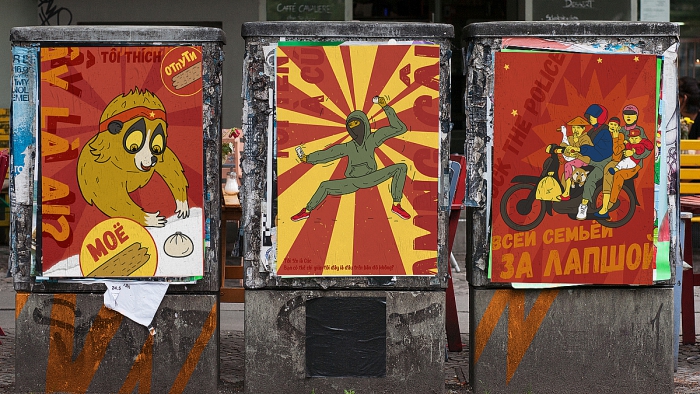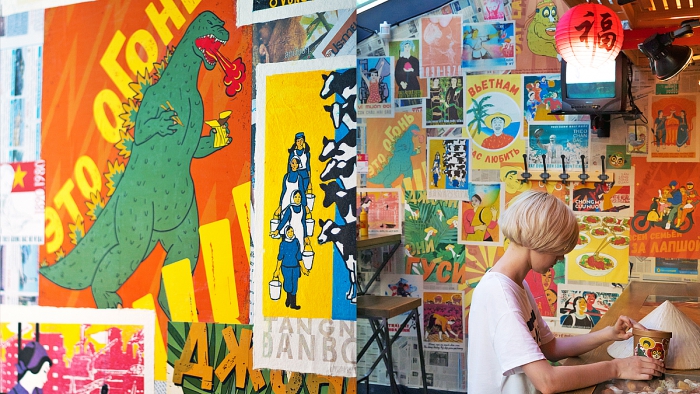 Для декора стен решили использовать плакаты и иллюстрации. Часть постеров привезены из Вьетнама, а часть разработали мы. Сюжеты — весёлые зарисовки: семья на байке с детьми и собакой, ниндзя, люди в азиатских конических шляпах. Получилось органично и очень весело. Цветовая гамма тёплая и сочная, ведь Азия — это солнце, море, пышная зелень, смесь ярких красок в одежде, блюдах, украшениях. Эти цвета заложены в общую гамму для айдентики и интерьера.