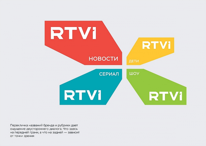 Новый логотип RTVI представляет собой многоугольник, создающий у зрителя за счет оптической иллюзии впечатление объема. Также, была разработана динамическая система логотипов, меняющих свою форму в зависимости от эмоциональных (динамика, серьезность, острота и т.д.) или функциональных (длина названия рубрики) особенностей контента.