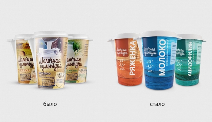 Мы выделили логотип «Молочной культуры», разместив на цветной плашке, ставшей охранным полем логотипа. Таким образом решили проблему считываемости названия марки на упаковке всех видов продукции. Ранее логотип терялся на иллюстративно-информационном фоне, у которого не было единой линии оформления для разных продуктов, вследствие чего отсутствовал четкий идентификатор бренда. Теперь на любой упаковке сразу считывается, что это продукт «Молочной культуры».