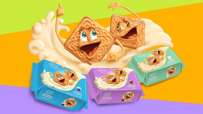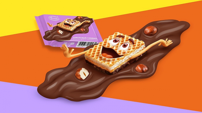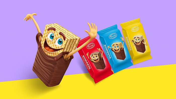 Дизайн упаковки построен полностью на игровом моменте – персонажах, через которых идет маркетинговая коммуникация. А так как спецификой кондитерских изделий является необходимость показывать на упаковке вкусные фуд-зоны, дабы вызвать у потребителя желание купить продукт, мы предложили создать продукт-персонаж. Эмоциональный посыл персонажа – это удовольствие и радость – те эмоции, которые испытывает человек при лакомстве сладостями.