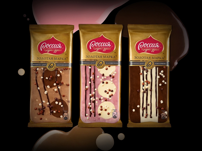 Результатом проекта стал шоколад, в котором удалось сохранить неповторимую эстетику ручной работы при машинном серийном производстве. И теперь каждый может попробовать настоящее произведение кондитерского искусства, купив его в соседнем магазине. Разумеется, дизайн «Золотой марки» также передает уникальность оформления продукта, не выбиваясь при этом из общего визуального стиля линеек «Россия – щедрая душа!». Основным цветом, сообразно названию, было выбрано золото, на лицевой стороне упаковки изображена имитация прозрачного окна, в котором «видна» фактура и элементы украшения плитки. Всего разработано было три «дуэта» вкусов с собственным дизайном: «в карамельном», «в молочном» и «в клубничном». Кроме того, на упаковке впервые был изображен обновленный агентством логотип «Россия – щедрая душа!», который вскоре появится на всей линейке марки.