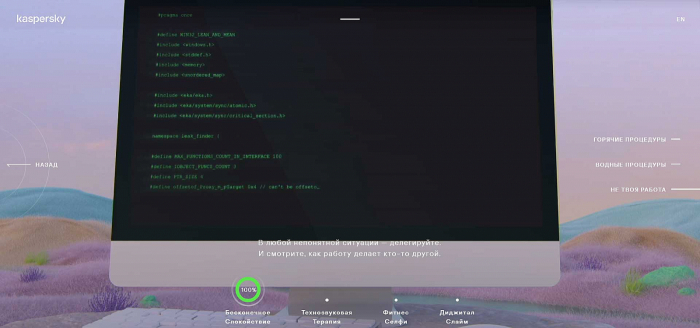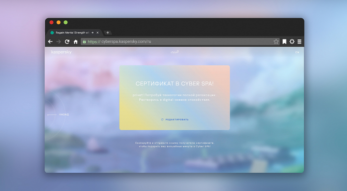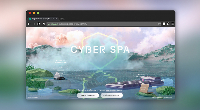 «Лаборатория Касперского» и DDB Russia создали Cyber Spa — виртуальное пространство для комплексной релаксации, где собраны разные способы борьбы со стрессом и тревожностью. Попав на сайт релакс-проекта, пользователь мог выбрать необходимые ему «процедуры», разработанные на базе популярных психологических методик: «Диджитал-слайм», «Фитнес-селфи», «Технозвуковую терапию» и «Бесконечное спокойствие».