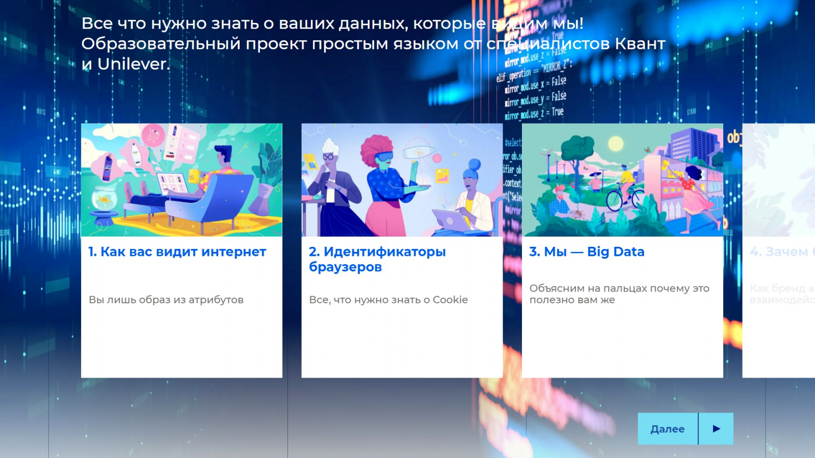 В рамках проекта пользователям рассказывают, как работает big data, что большие данные дают обычным пользователям и как помогают брендам, что такое файлы сookie, можно ли спрятаться за режимом «Инкогнито», какие данные собирают сайты, как защищена информация пользователей на законодательном уровне и как дальше будет развиваться искусственный интеллект в области сбора данных. Проект стал эффективной образовательной площадкой.