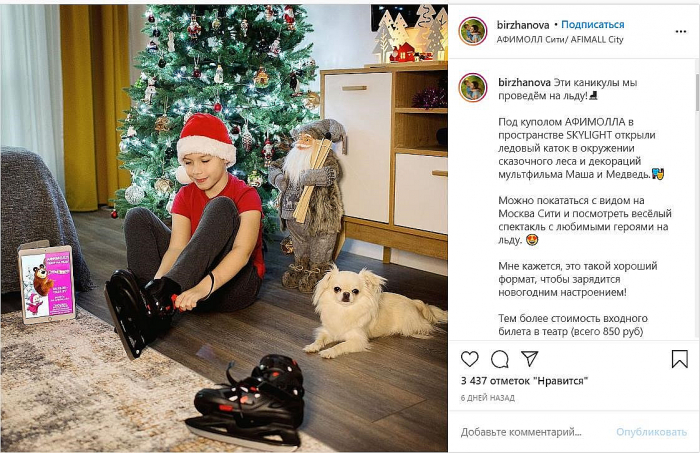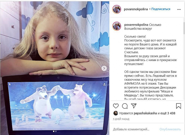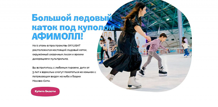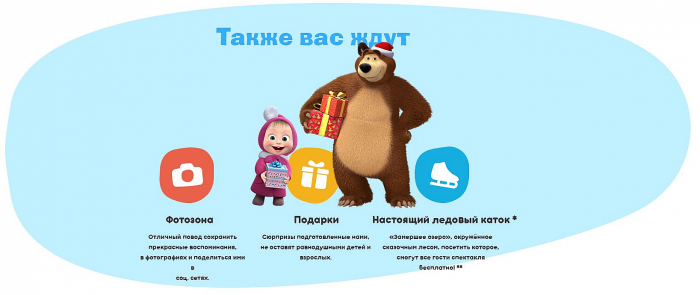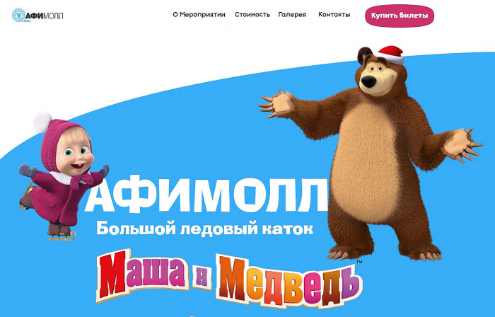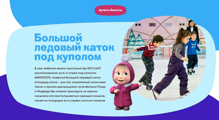 На 6-м этаже под куполом ТЦ «Афимолл Сити» появился большой ледовый каток, окруженный сказочным лесом и яркими декорациями мультфильма «Маша и Медведь». Дети и взрослые могли покататься на коньках с видом на Москва Сити, а также посмотреть весёлый спектакль на льду в исполнении «Творческого объединения 9».